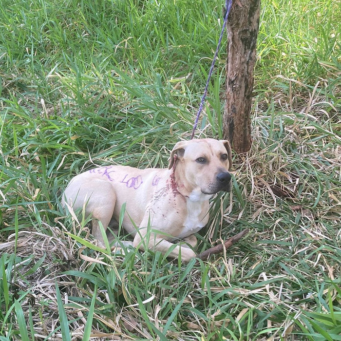 Injured Dog Found Tied To A Tree And Covered In Pen Marks