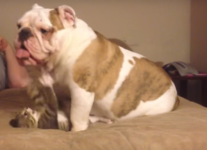 This English Bulldog Is Playing Cool, While His Kitten Friend Is Teasing Him To Play!