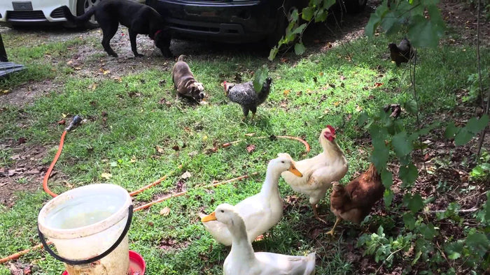Adorable English Bulldog Plays With Her Friends, Ducks And Chickens, Outside!