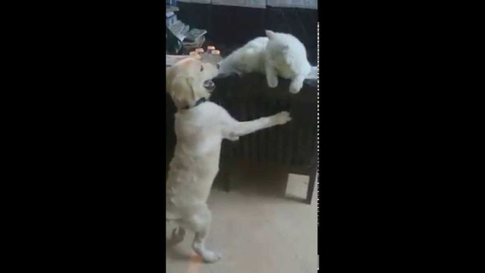 Super Cute Golden Retriever Shows The Fluffy Cat What It's Like To Be...A Cat?!