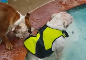 Bulldog Pulls His Bulldog Brother Out Of The Pool By His Life Vest!