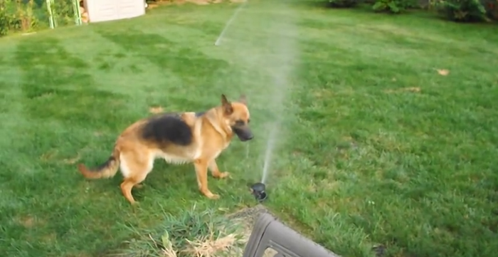 Mighty German Shepherd Gets Entertained By Tiny Water Sprinkler!