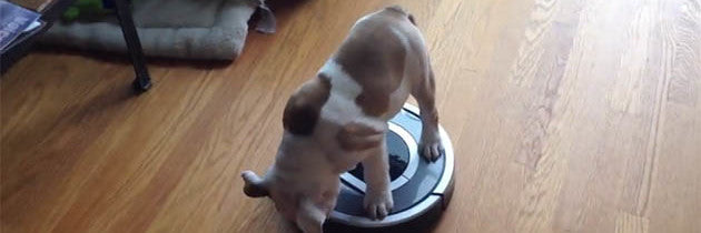 Hilarious English Bulldog Puppy Rides The Roomba!