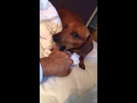 Cletus The Dachshund Is Trying To Mouth His Dad's Fingers! So Cute!