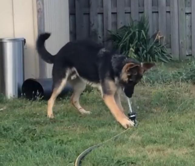 German Shepherd Puppy Is Trying To Play With The Hose!