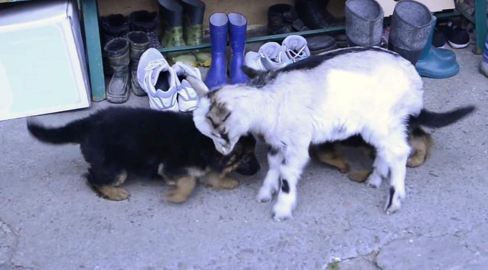 Super Cute Video! German Shepherd Puppies Are Happily Playing With A Little Goat!