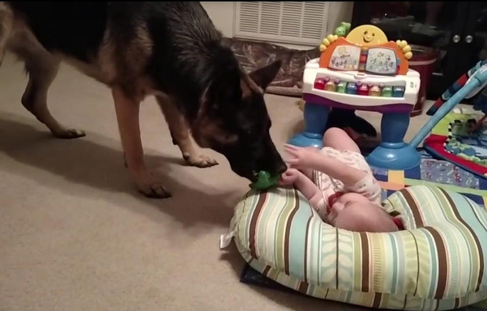 German Shepherd Is Sharing His Toy With A Little Baby!
