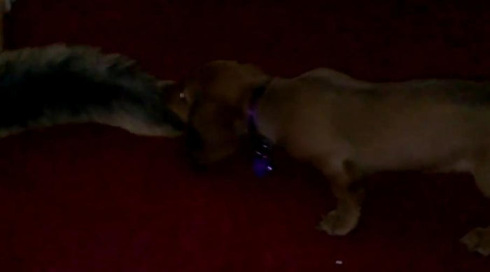 German Shepherd Mix Is Playing Cool While A Dachshund Is Playing With His Tail!