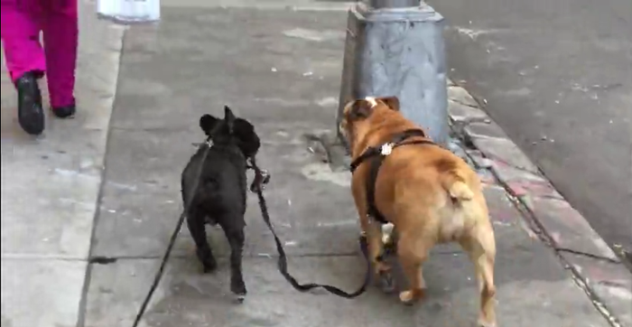 French Bulldog Puppy Takes His Friend, An Adult English Bulldog For A Walk!