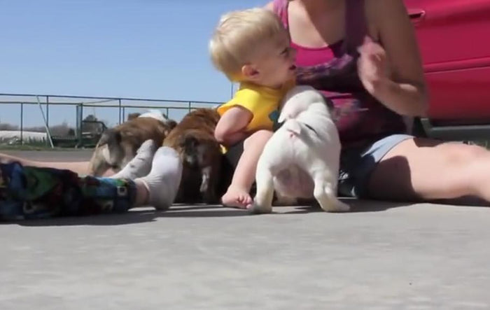 This Is Super Cute! Baby Meets Newborn Bulldogs And His Reaction Is Awwww!