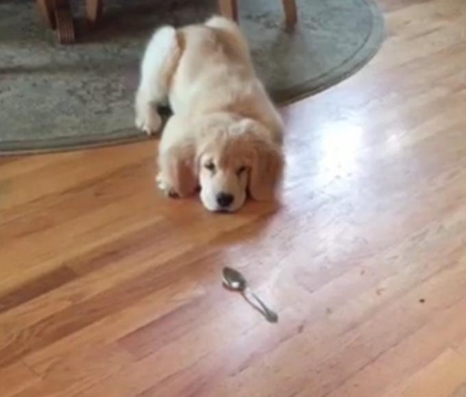 Extremely Cute Golden Retriever Puppy Doesn’t Trust The Spoon!