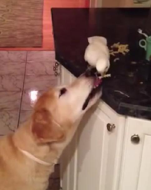 This Bird Is Feeding A Labrador Retriever Some Pasta!