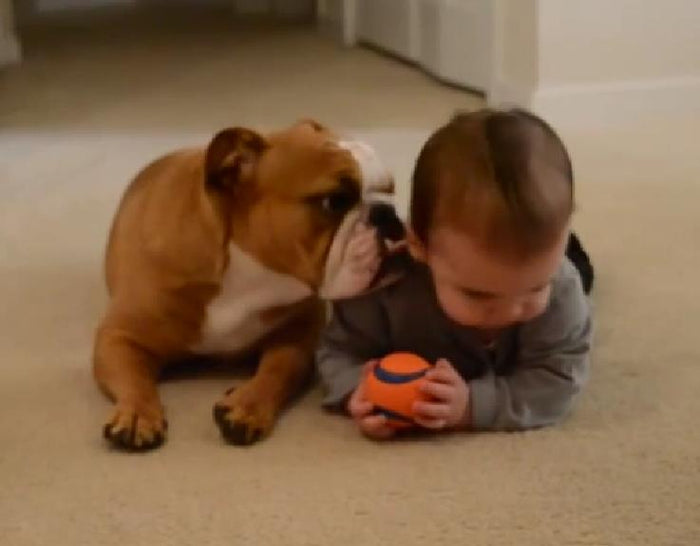 Gorgeous Little Baby Steals Toy From English Bulldog And His Reaction Is Awesome!