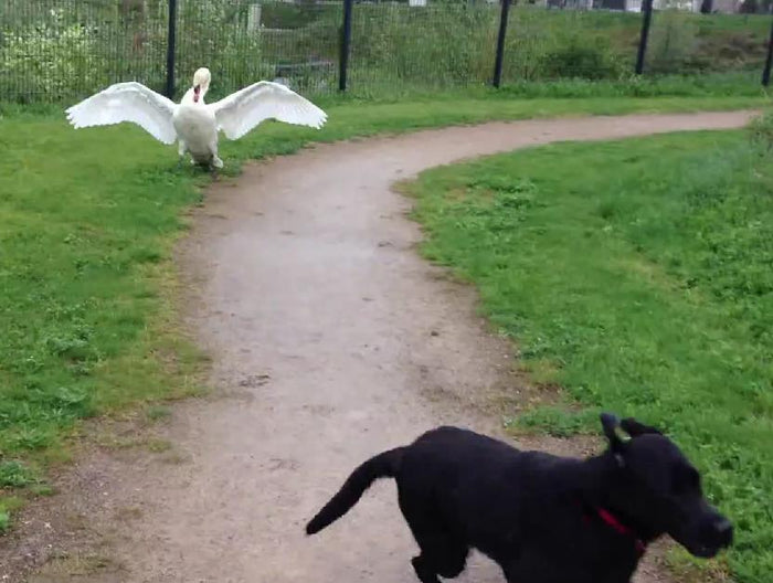 This Curious Labrador Retriever Is Trying To Have Some Fun With A Swan!