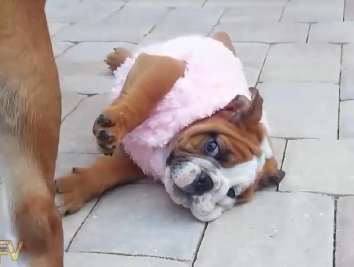 English Bulldog Daddy Accidentally Knocks His Daughter Over, And She Can’t Get Up!