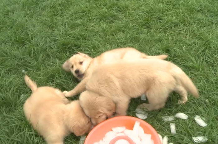 Gorgeous Golden Retriever Puppies Playing With Ice Cubes!
