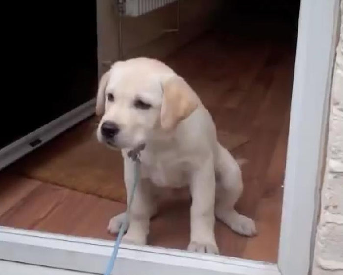 First Steps Are Always The Hardest. This Labrador Puppy Is Scared To Cross The Door Threshold For His First Walk And He's Adorable!!