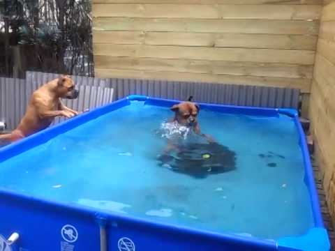 Their Favorite Toy Is At The Bottom Of The Pool. The Two Bulldogs Work Together To Retrieve It!