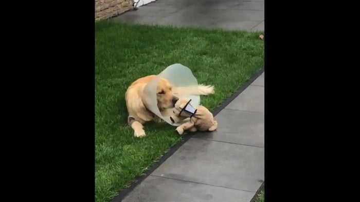 Post Surgery, Adorable Dog Comforts His Toy Who's Also Wearing A Cone