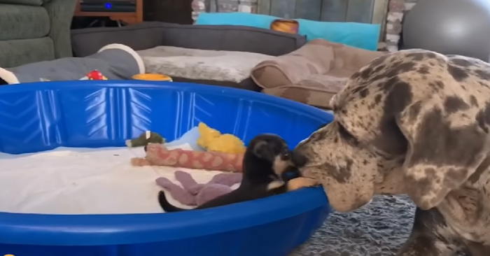 Great Dane Gets Adopted For Helping To Foster Orphaned Puppies And Kittens