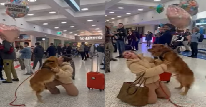 Excited Golden Retriever Can't Wait To Welcome Mum At The Airport!