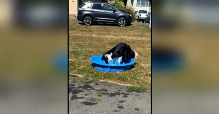 Dog Enjoys Relaxing In A Small Buckets Filled With Water